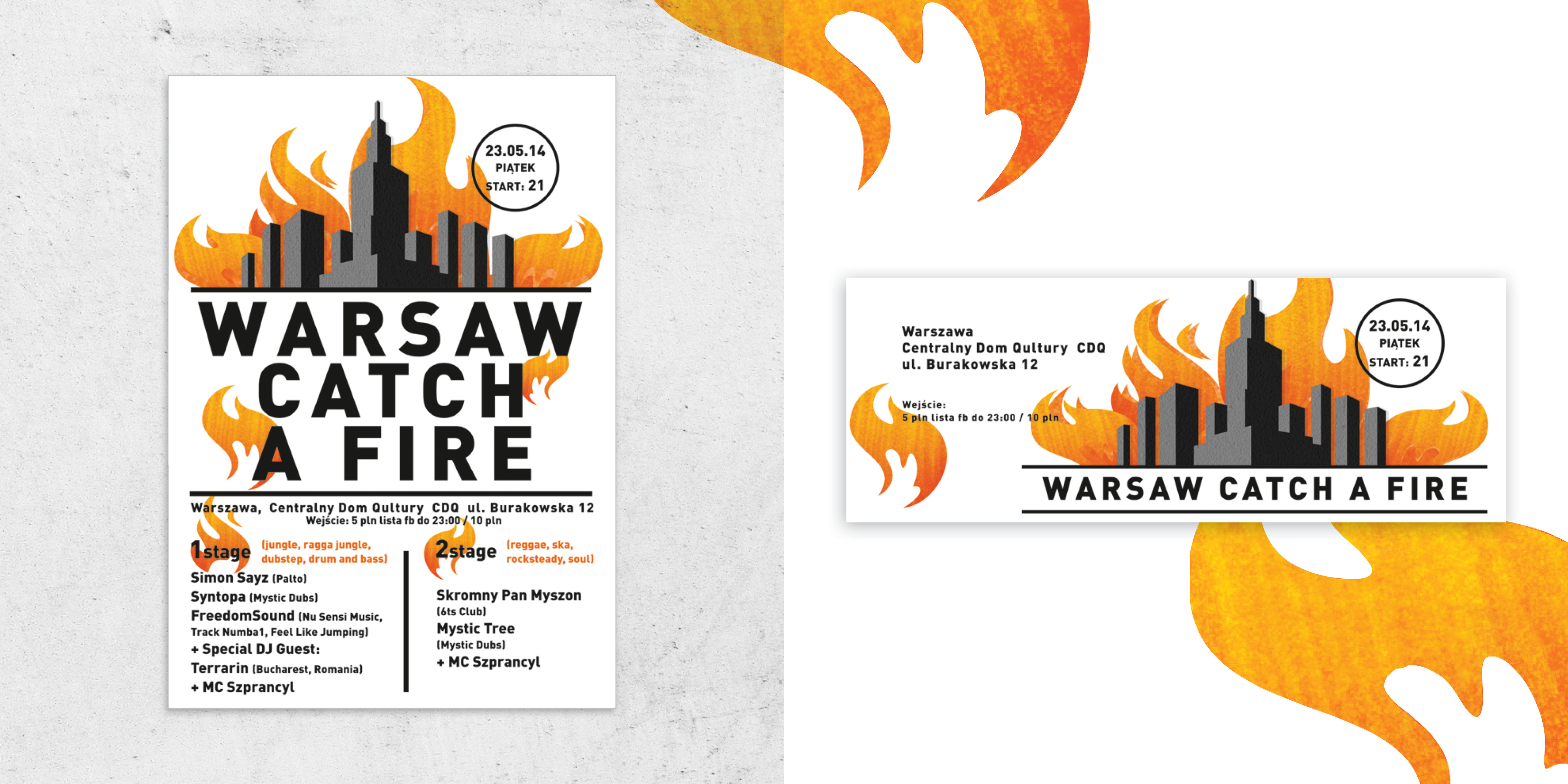 Plakat i baner na facebooka promujące imprezę muzyczną Warsaw Catch a fire dla Freedom Sound Art Agency, format A3, 2014