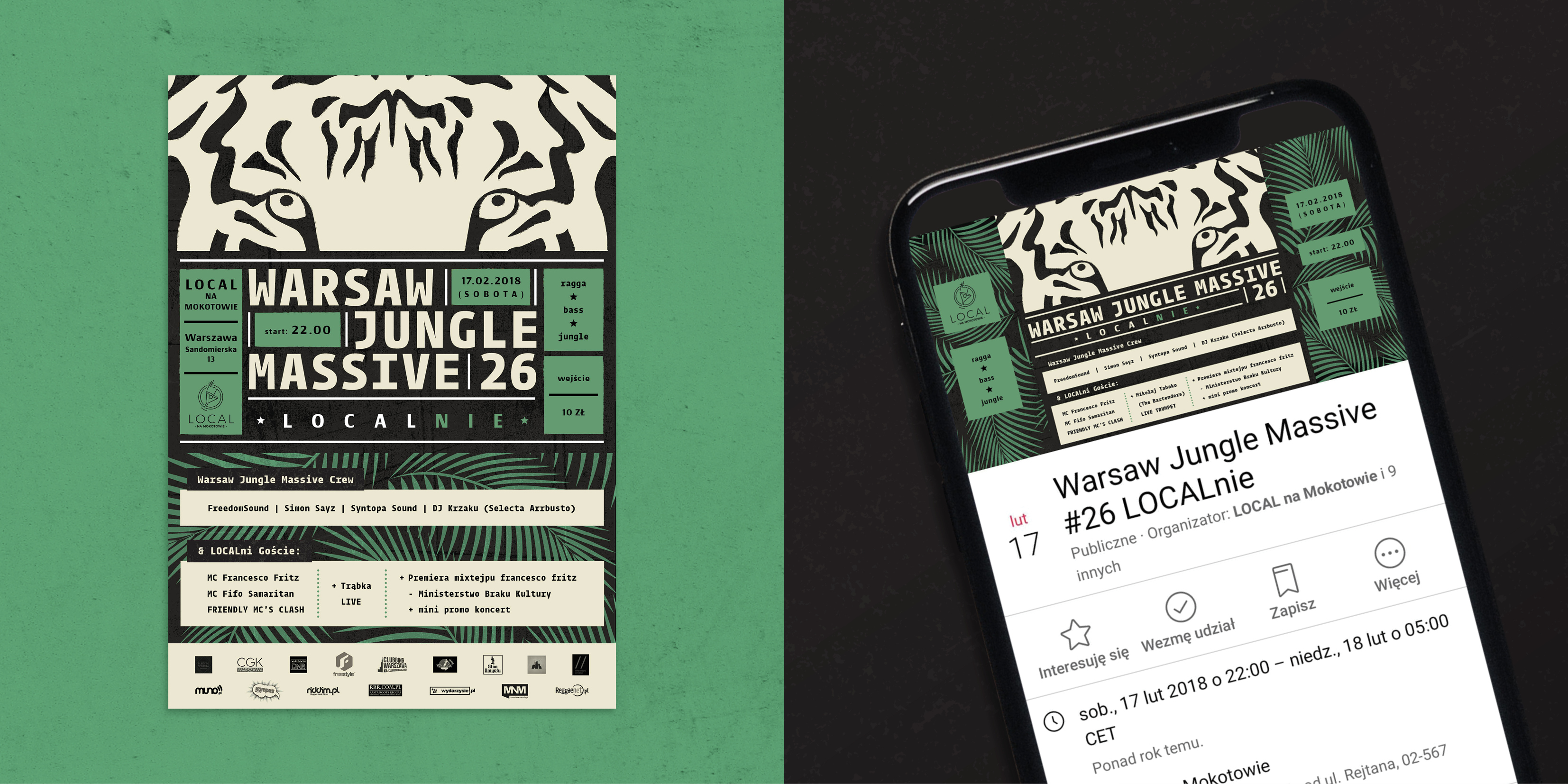 Plakat i baner na facebooka promujące cykl imprez Warsaw Jungle Massive dla Freedom Sound Art Agency, format A3, 2018