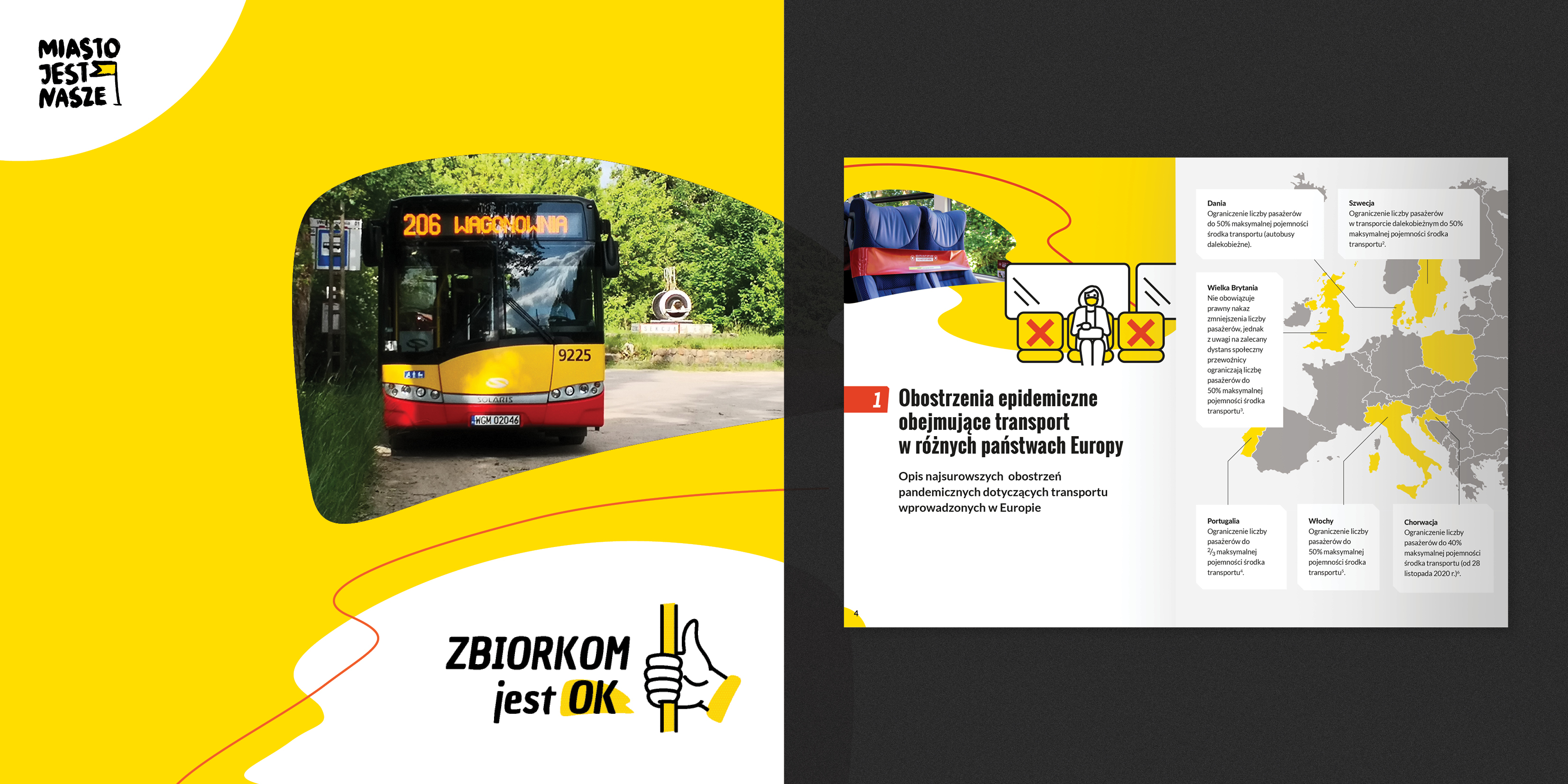 Identyfikacja wizualna kampanii “Zbiorkom jest ok” dla stowarzyszenia Miasto jest Nasze - logo+ skład raportu,2021