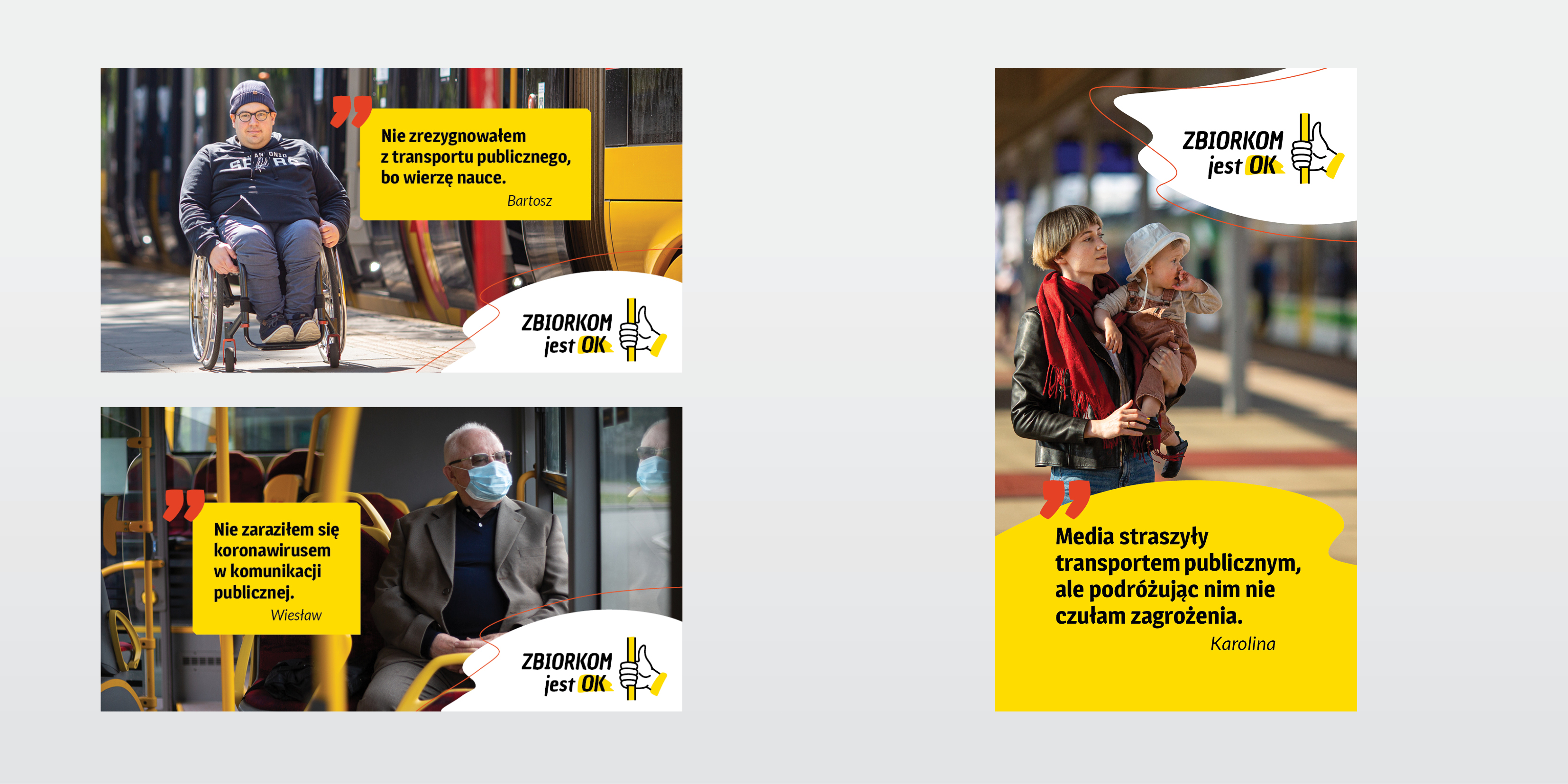 Identyfikacja wizualna kampanii “Zbiorkom jest ok” dla stowarzyszenia Miasto jest Nasze - grafiki na media społecznościowe (fotogarfie: Tomasz Kaczor), 2021